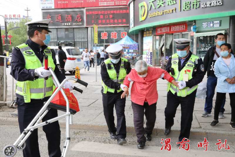 4月16日,交警孟刚鹏,李斌,周红军,正在搀扶老人通过斑马线。